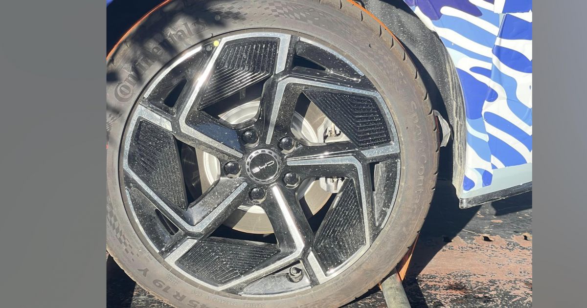 The electric sedan appears to be finished in a greyish blue, though much of it is wrapped in camouflage. A closer squint reveals it rides on Continental SportContact 235/45R19 tyres.